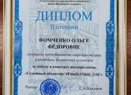 Одной из победительниц конкурса стала старший преподаватель кафедры теории и методики физической культуры Ольга Фёдоровна Фомченко. Она заняла почетное II место, показав на своем примере, что для неё «семейные ценности» – это не просто слова, а реальная жизненная философия. Будучи многодетной мамой, Ольга Фёдоровна находит время и для педагогической деятельности, и для активной семейной жизни.